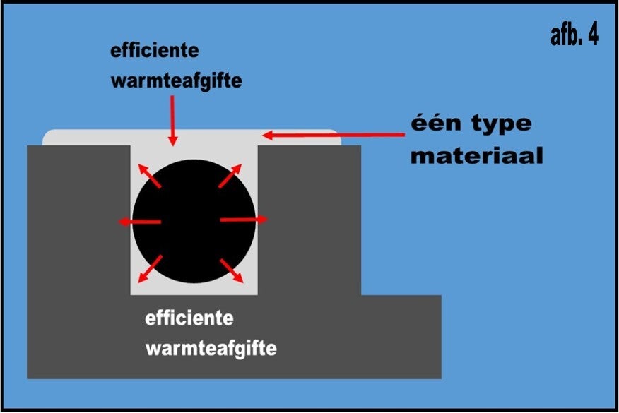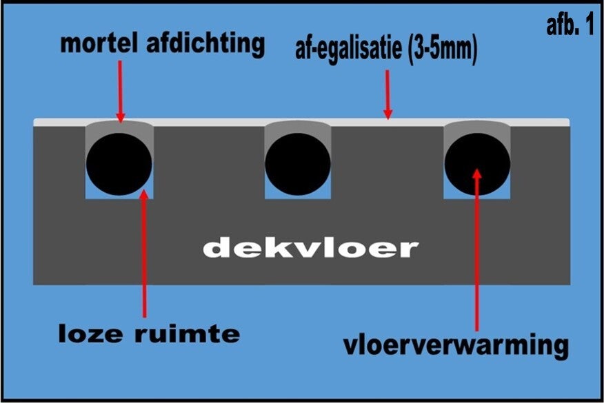 Dit kan op twee manieren. Een veel gebruikte manier is de bovenzijde van de sleuf dichtsmeren met een reparatie mortel en deze vervolgens af te egaliseren (afbeelding 1). Dit is vaak de goedkoopste oplossing. Goedkoop is echter betrekkelijk omdat de warmteopbrengst minder efficiënt is zal het namelijk meer energie kosten om een ruimte te verwarmen en dat zorgt weer voor een hogere energierekening. In afbeelding 2 zie je dat de warmteafgifte aan een lucht houdende ruimte is waardoor de warmte slechts gedeeltelijk rechtstreeks aan de vloer wordt afgegeven. Daarnaast is de hechting van dekvloer + mortel + egaline minder sterk omdat je met 3 verschillende producten werkt (met hun eigen specifieke eigenschappen) en holtes een constructie simpelweg verzwakken. De tweede methode (afbeelding 3) is een veel betere methode.